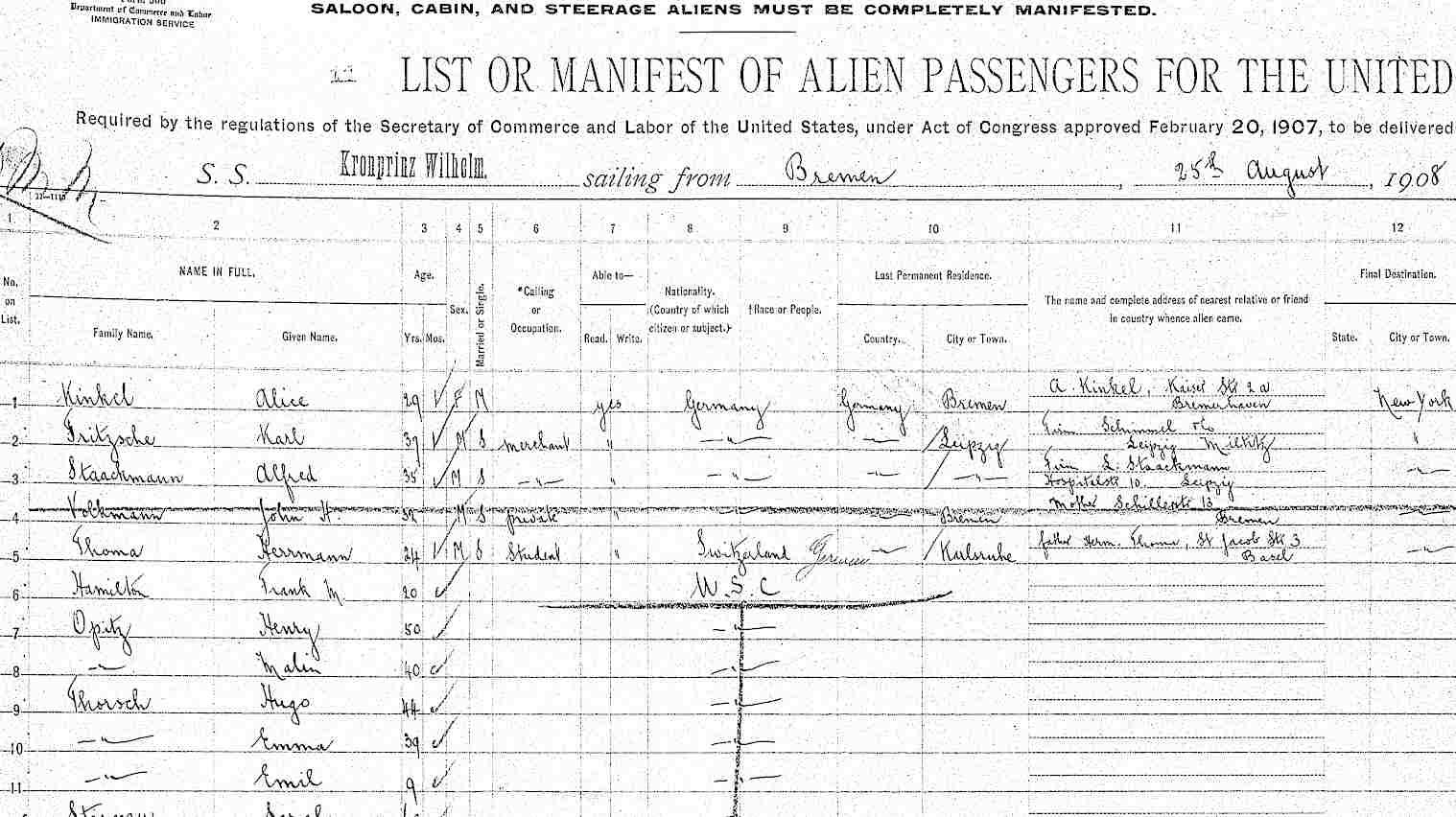Passagierliste 1908 / list of passengers 1908